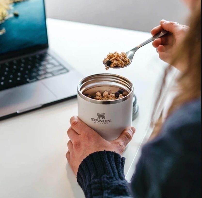 فلاسک غذای استنلی مدل TO-GO FOOD JAR – حجم ۵۳۰ میلی لیتر سری ADVENTURE, یک فلاسک مناسب برای تمامی افراد در تمامی مکان ها. وقتی بیرون از خانه هستید، هیچ چیز به اندازه یک ناهار گرم یا میان وعده سرد در محل کار یا هنگام سفرهای ماجراجویانه و یا حتی در روز های طولانی در مدرسه مزه نمی دهد. از سوپ گرفته تا پاستا، میوه یا ماست و هر چیز دیگری را شما می توانید در این فلاسک با خود حمل کنید. صبح ها ظرف غذای Adventure To-Go را با غذا و یا مواد غذایی دلخواه خود پر کنید و نگران سرد و یا گرم شدن غذای خود نباشید چرا که عایق دو جداره کار خود را انجام می دهد و همه چیز را سرد یا گرم نگه می دارد و زمانی که شما قصد خوردن غذا را دارید برای شما آماده است. این فلاسک غذا ضد نشتی بوده و دارای بسته بندی فوق العاده مدرن و ساده می باشد . فقط فلاسک غذای استنلی را پر کنید و آن را در کیف خود قرار دهید و به راحتی آن را با خود حمل کنید. فلاسک غذای استنلی مدل TO-GO FOOD JAR قدرت نگهداری 4 ساعته سرد و گرم را دارد